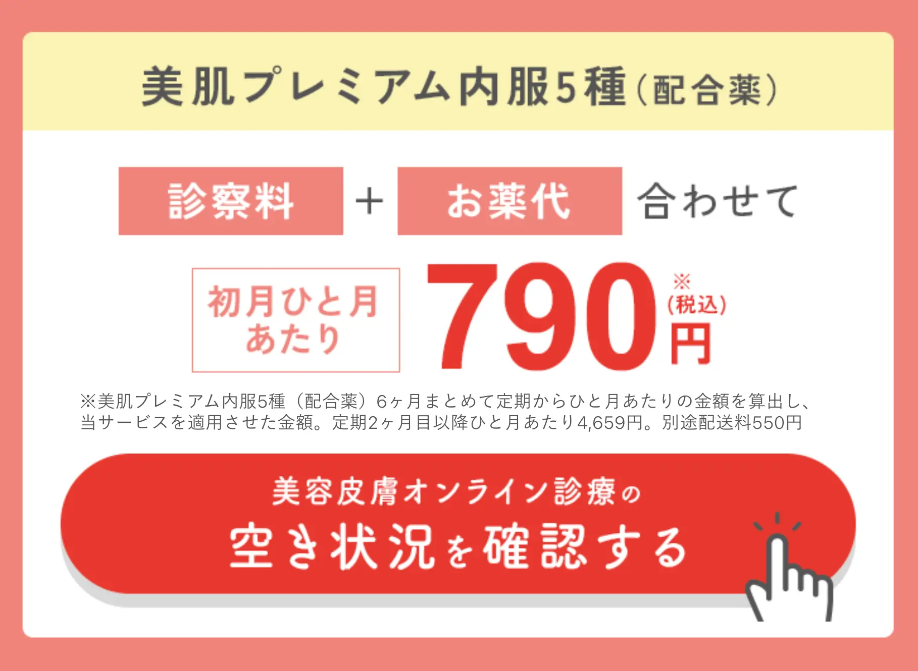 「美肌プレミアム内服5種(配合薬)」と「美容内服4種」の3ヶ月/6ヶ月/12ヶ月まとめて定期プランが対象!診察料無料・お薬代3,869円OFFキャンペーン中です。